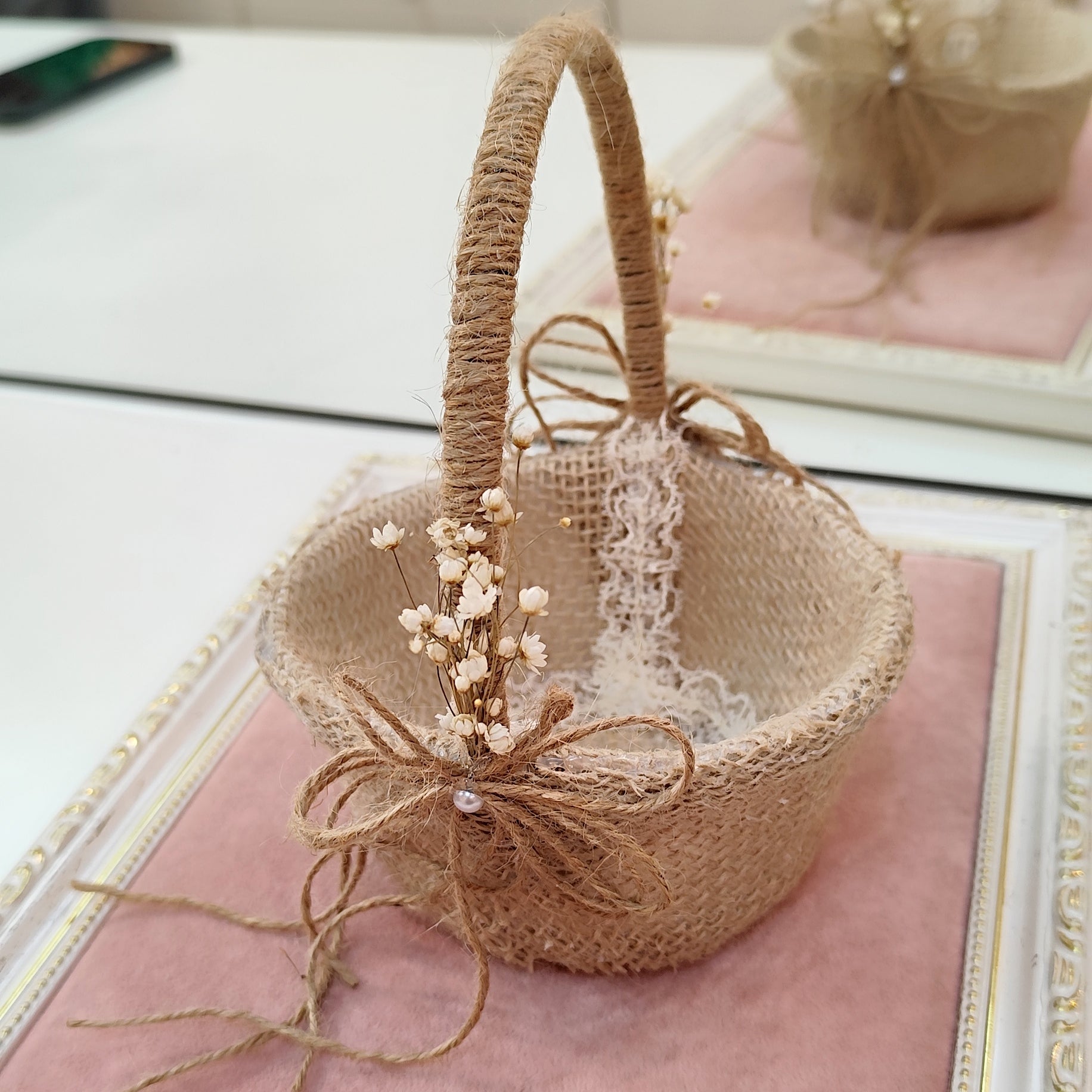 Cesta para daminha ou florista com flor seca material juta.