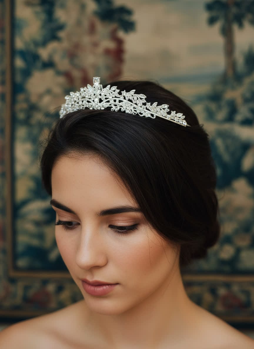 Coroa de cristais com banho de prata envernizado.