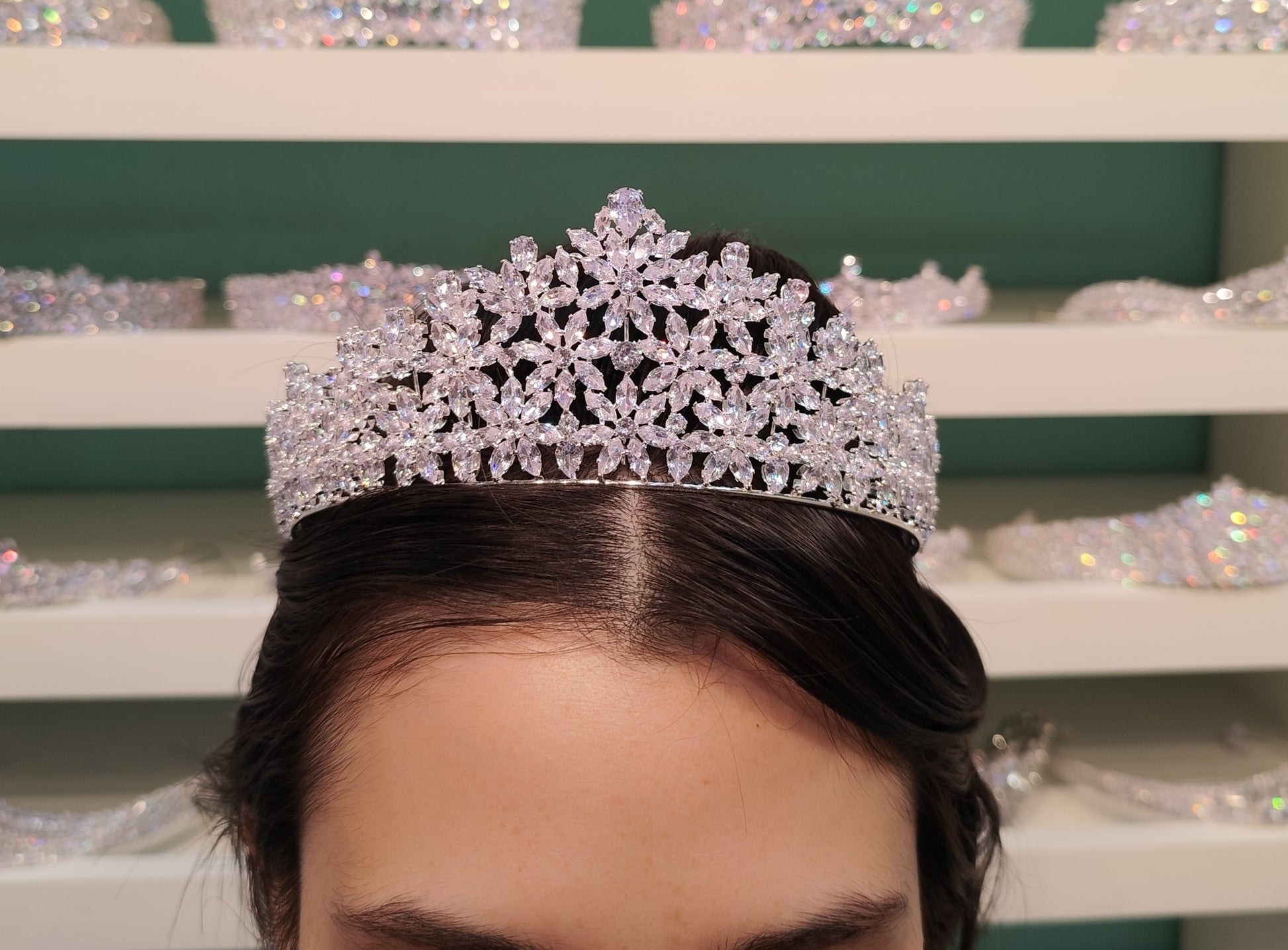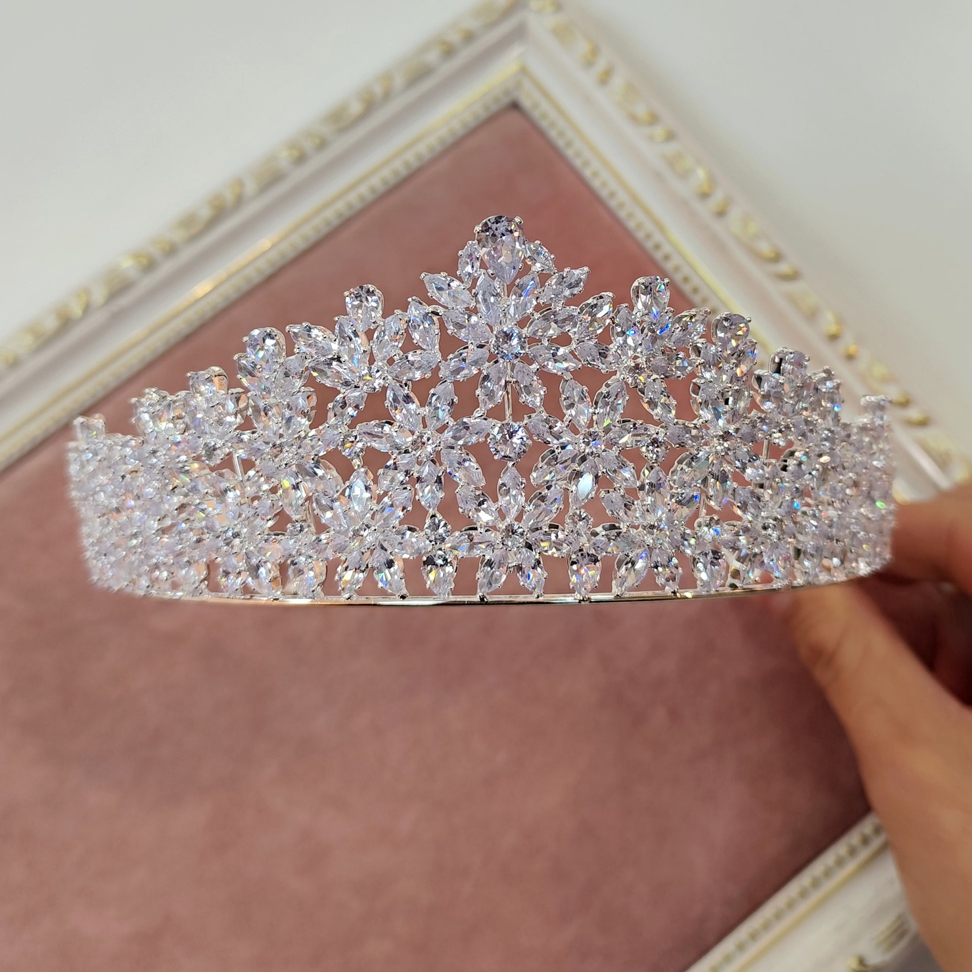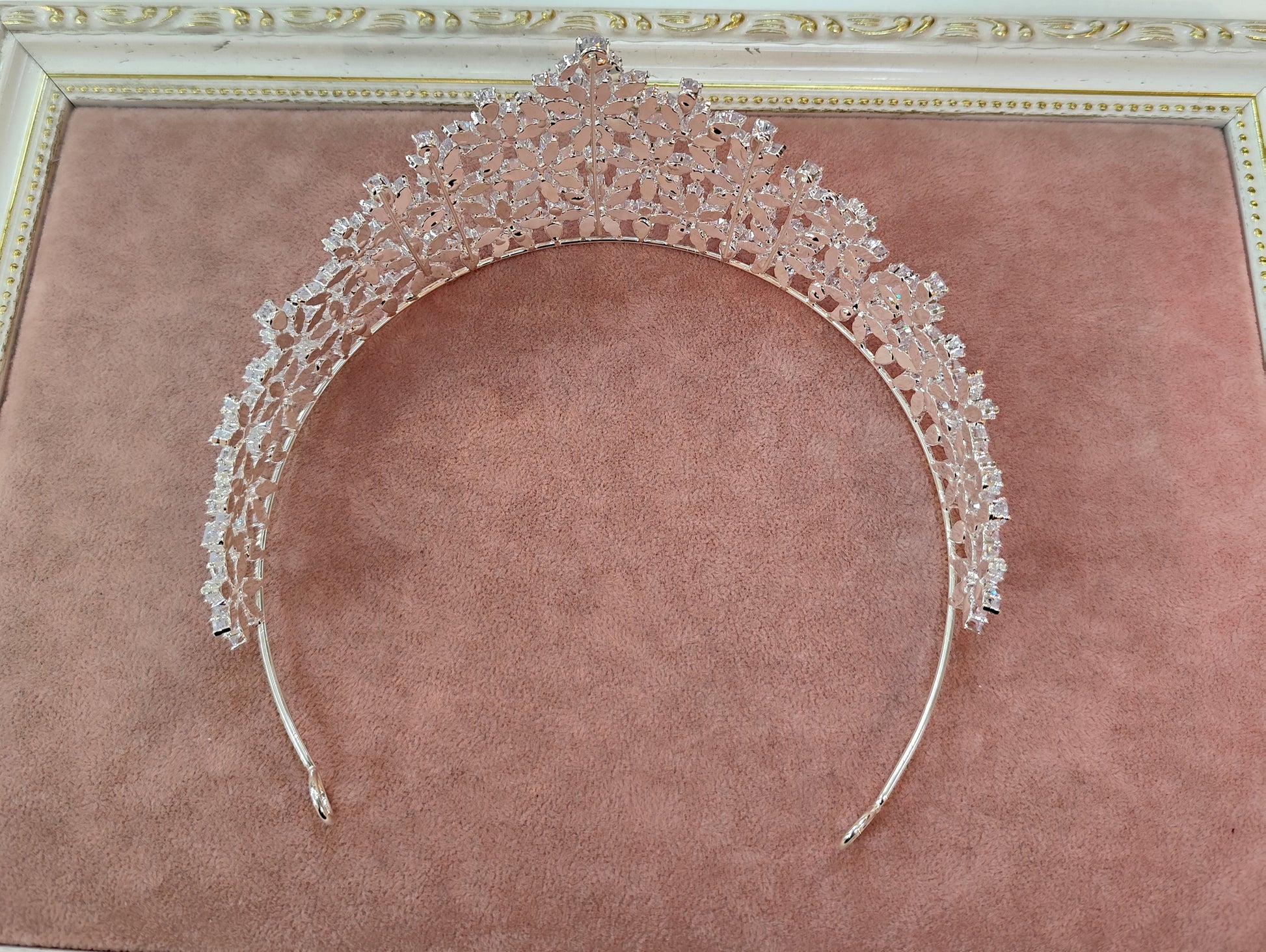 Tiara de zircônia com banho de prata envernizado.