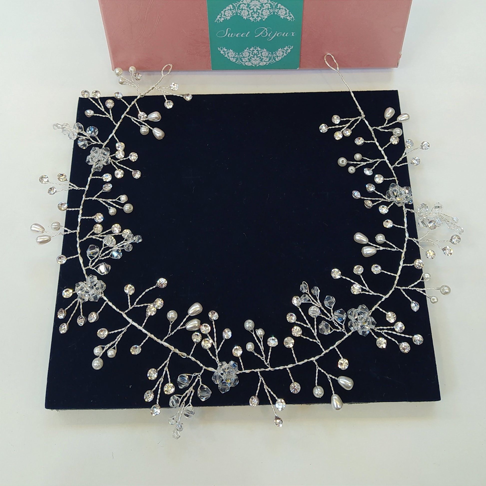 Arranjo de fio de cobre banhado a prata com cristais e pérolas para penteado.