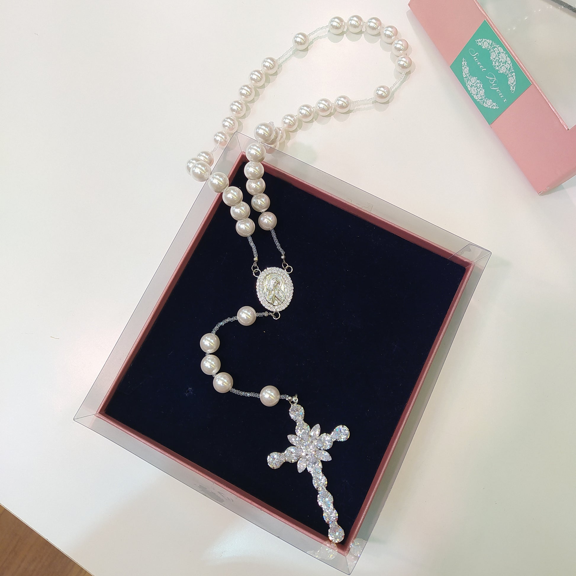 Terço de zircônia com pérolas shell de vidro no banho de prata.