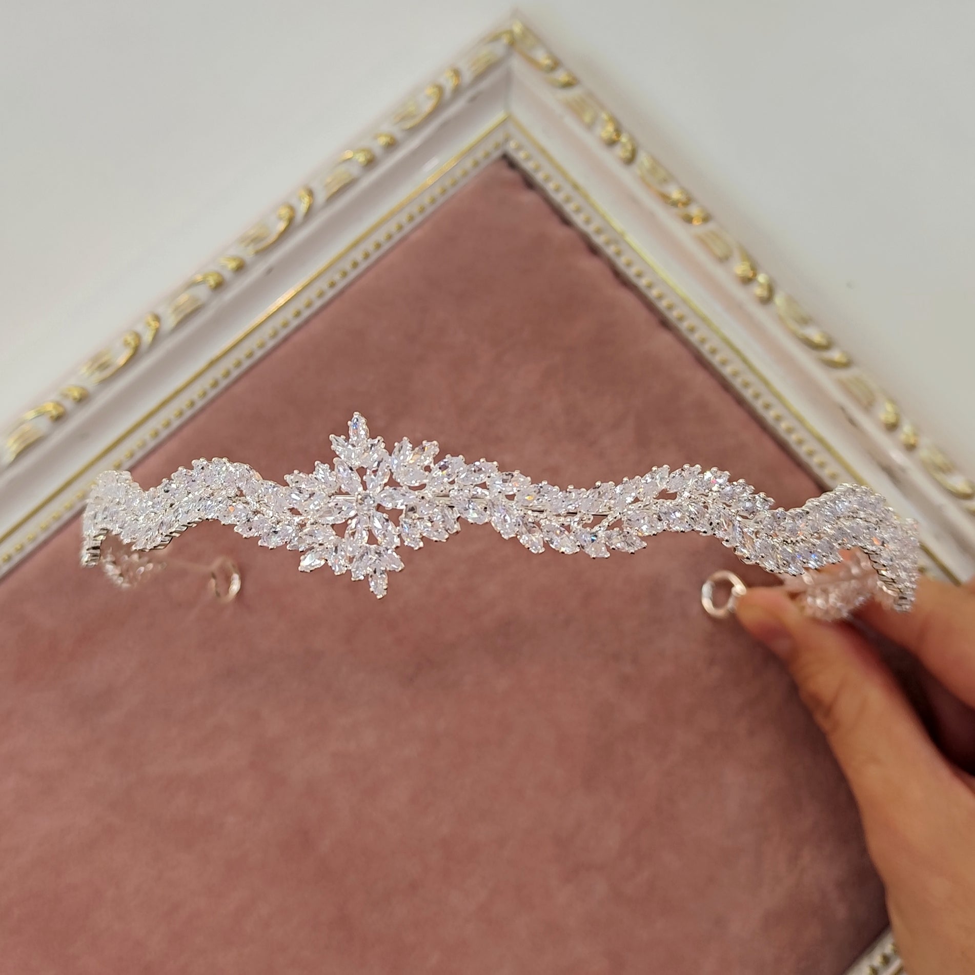 Tiara de zircônia com banho de prata envernizado.