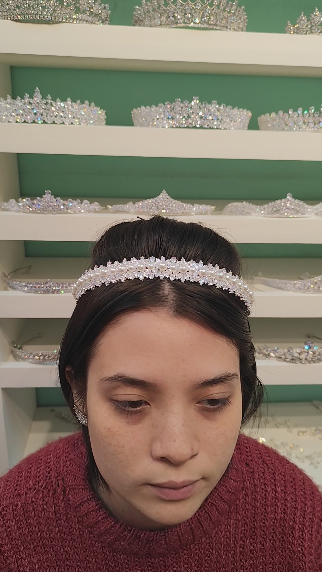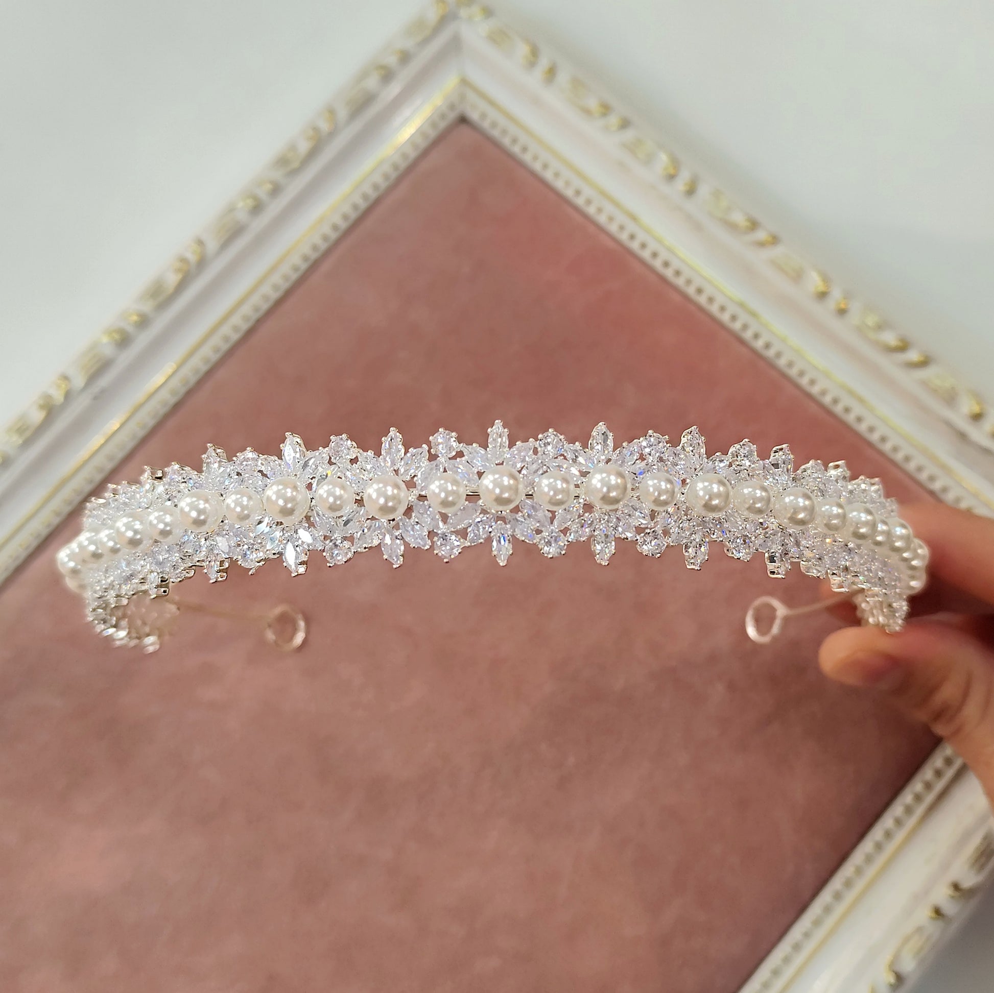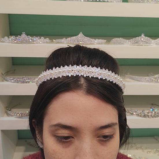 Tiara de zircônia e pérola com banho de prata envernizado.