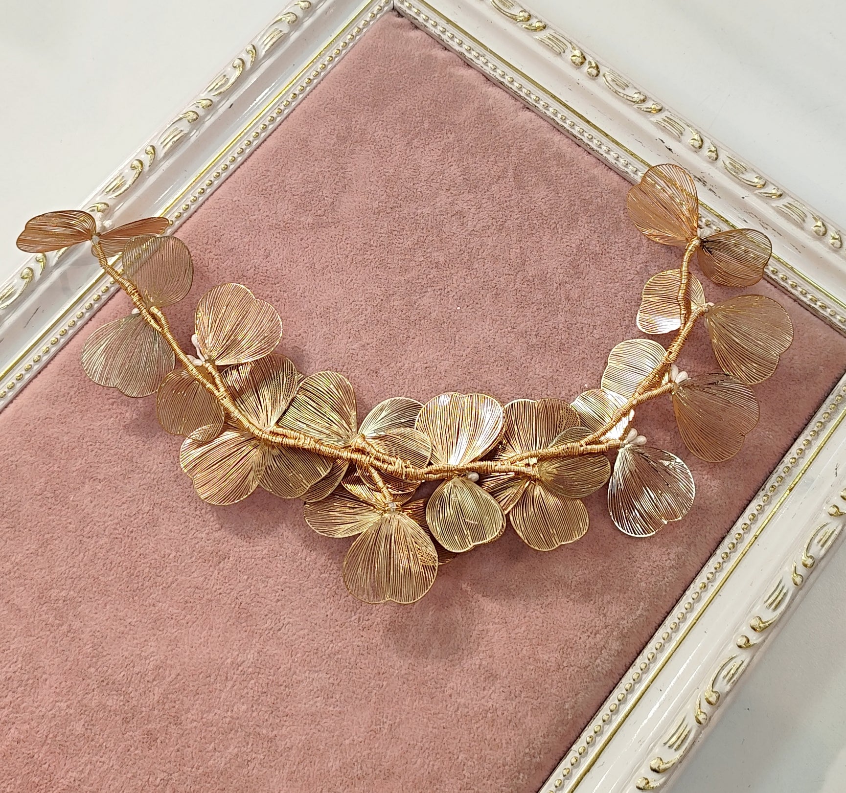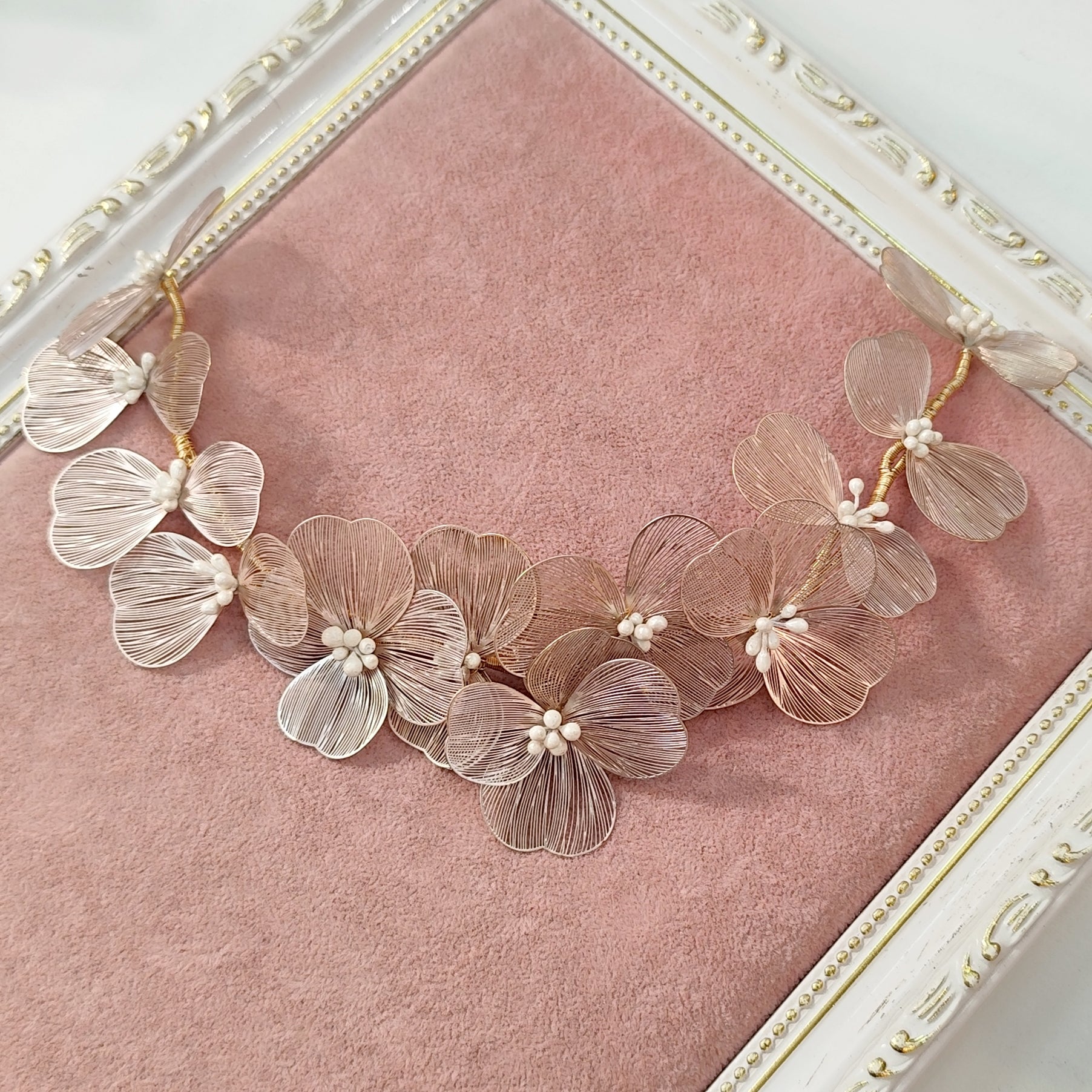 Tiara feita com fios de metal dourado com flores na cor nude com pérolas.